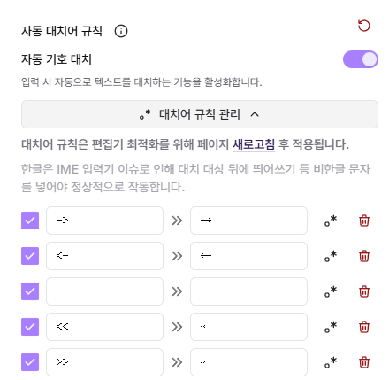- 자동 대치어 규칙 변경사항은 에디터 새로고침 후 적용됩니다.